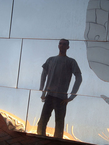Dressing was easy that morning, and soon he was ready to leave the apartment and head off to the library. He had put on a black t-shirt with a picture of Rufus Wainwright on the front that his boyfriend had bought him. He wore a pair of jeans with a hole in the right knee that he had acquired from his sister’s ex-boyfriend while staying with him in New York. It seemed the ex had become literally too big for his britches and so he passed them on to German. His shoes were yellow and blue Pumas he had purchased one sunny day while visiting the city he now lived in. He wore the black and silver watch he’d bought after his house burned down on his left wrist, and on the right one was a silver bracelet meant to raise AIDS awareness. He also wore two rings, one bought for him by his Russian friend while the two were running around the city late one night and one he purchased for himself. The gifted ring featured an elk-like animal amongst wild brambles, and the one he bought for himself was engraved with the name of his lover. The external appearance of this outfit was definitely less than the sum of his memories of all the disparate parts. And yet the colors and styles matched perfectly as he caught his reflection in the window of an office building.