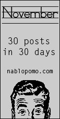 So I have opted to sign up for two separate but complimentary writing tasks for the month of November. In the first, represented by the picture above, I have agreed to simply post on this blog every day for the next month. In the second, a bit more challenging, I have agreed to attempt to write a novel (or 50,000 words) in a month. I will attempt to marry the two by blogging about my writing. Is this cheating? I don’t see it as such. But I suppose I’ll just have to type a lot right now and let you know what I think/thought come December.